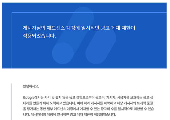 블로그에 ‘일시적인 광고 게재 제한’ 조치가 취해질 수도 있다는 것을 알게 되었다.